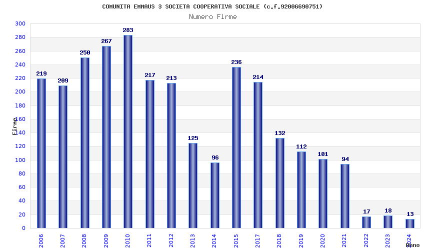 | Anno | Firme | Importi | Media | Naz. | Reg. | Prov. | Comu. |