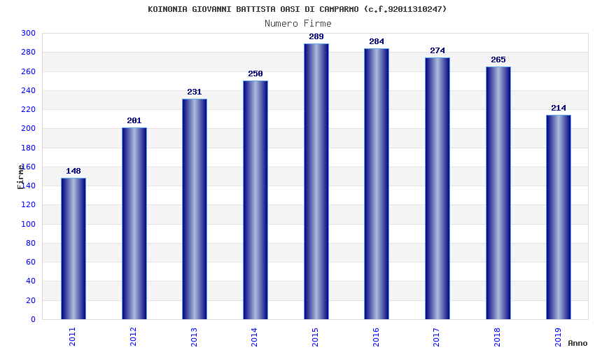 | Anno | Firme | Importi | Media | Naz. | Reg. | Prov. | Comu. |