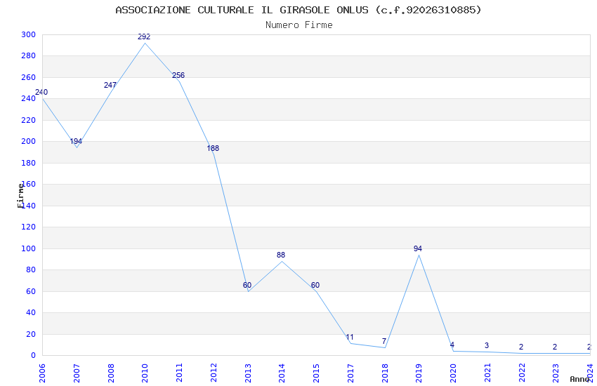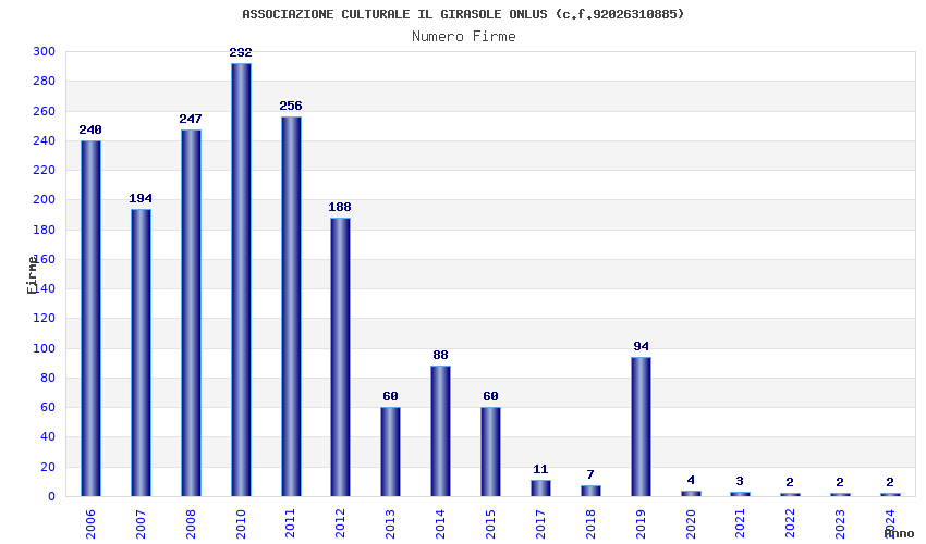 | Anno | Firme | Importi | Media | Naz. | Reg. | Prov. | Comu. |