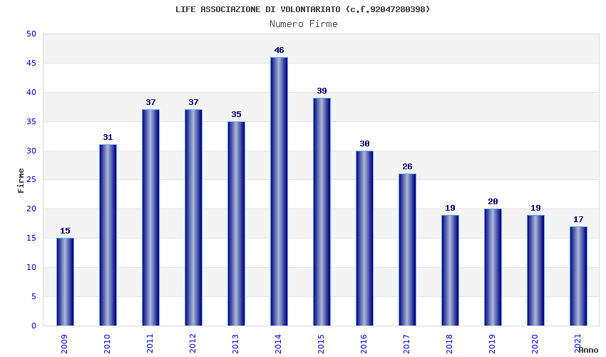 | Anno | Firme | Importi | Media | Naz. | Reg. | Prov. | Comu. |