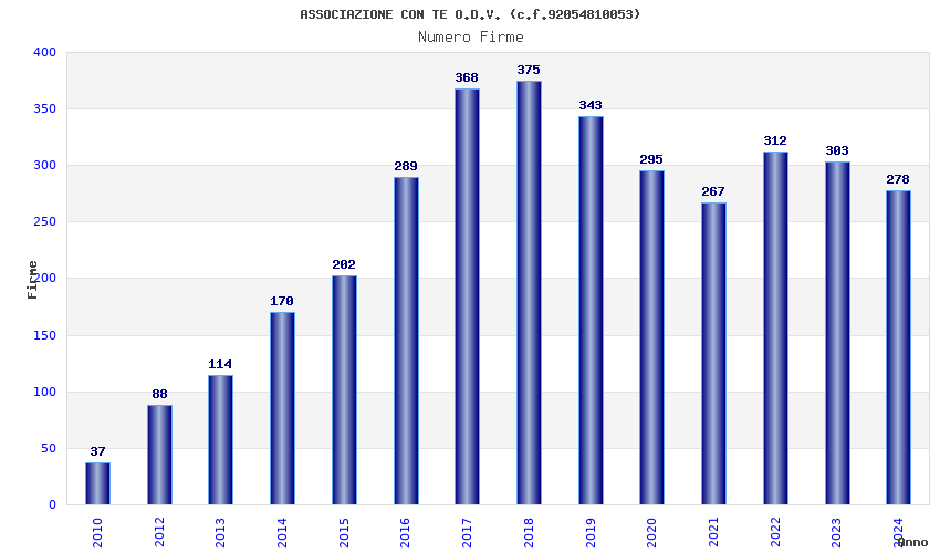 | Anno | Firme | Importi | Media | Naz. | Reg. | Prov. | Comu. |