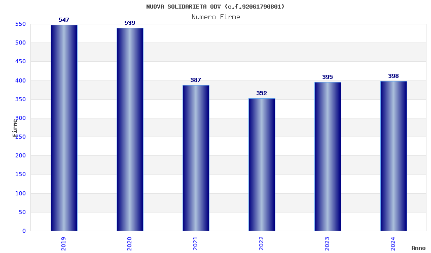 | Anno | Firme | Importi | Media | Naz. | Reg. | Prov. | Comu. |