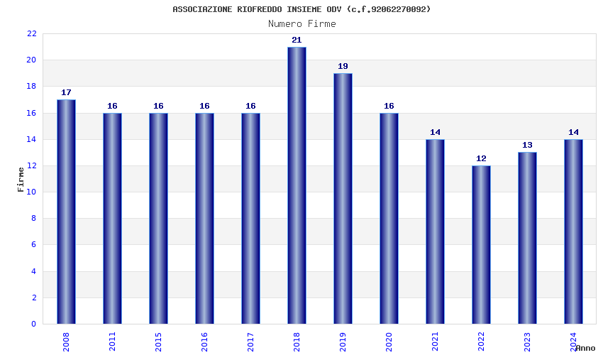 | Anno | Firme | Importi | Media | Naz. | Reg. | Prov. | Comu. |
