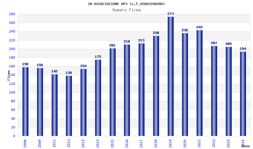 | Anno | Firme | Importi | Media | Naz. | Reg. | Prov. | Comu. |