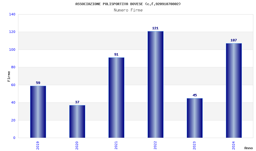 | Anno | Firme | Importi | Media | Naz. | Reg. | Prov. | Comu. |