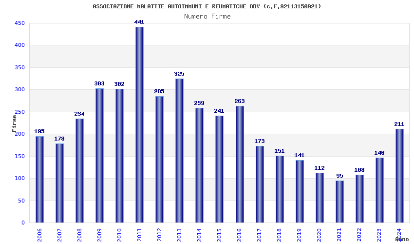 | Anno | Firme | Importi | Media | Naz. | Reg. | Prov. | Comu. |