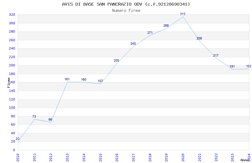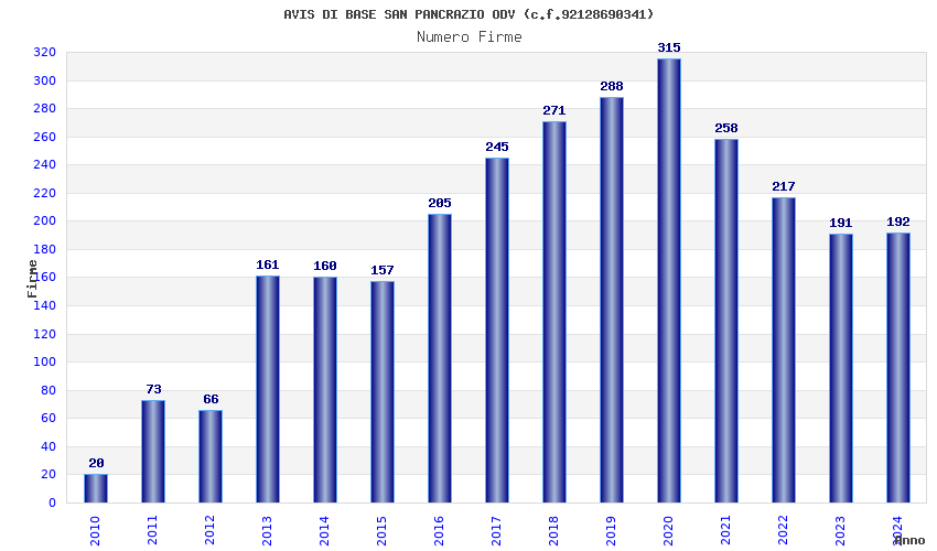| Anno | Firme | Importi | Media | Naz. | Reg. | Prov. | Comu. |