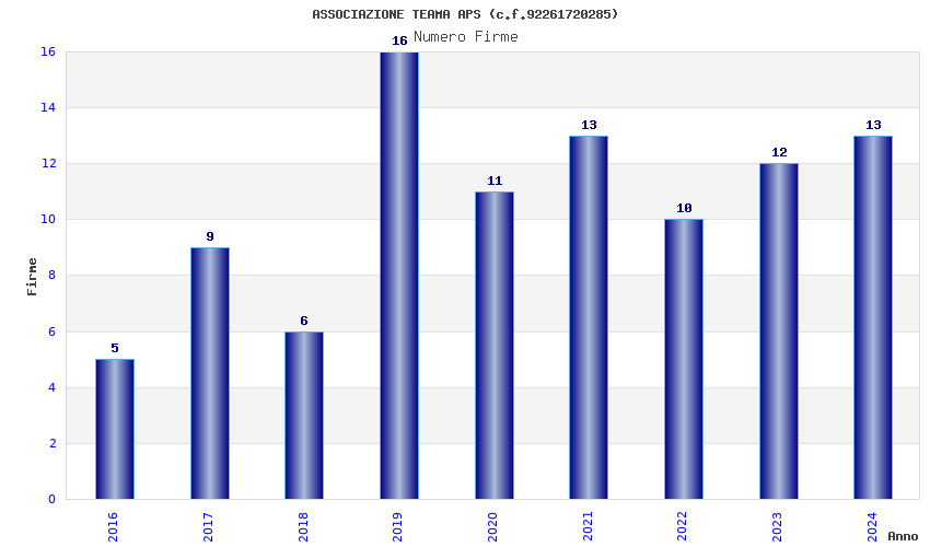 | Anno | Firme | Importi | Media | Naz. | Reg. | Prov. | Comu. |