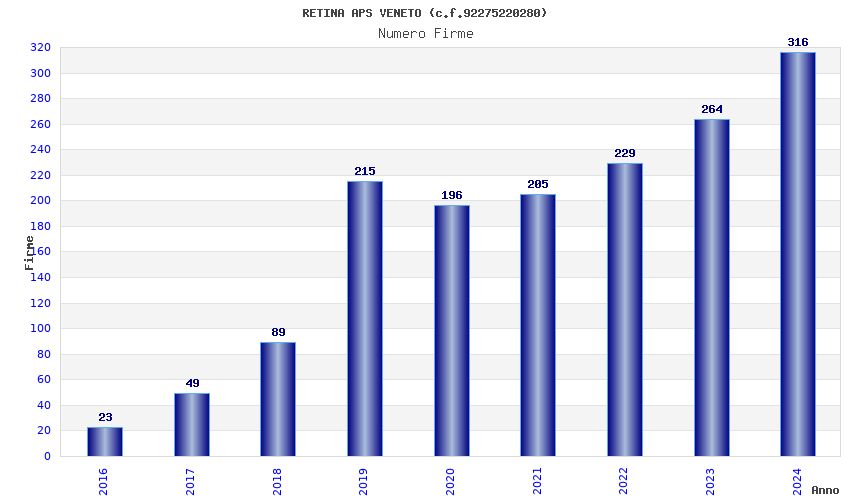 | Anno | Firme | Importi | Media | Naz. | Reg. | Prov. | Comu. |