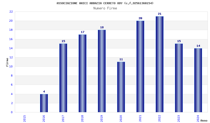 | Anno | Firme | Importi | Media | Naz. | Reg. | Prov. | Comu. |