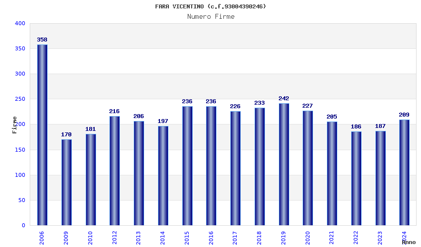 | Anno | Firme | Importi | Media | Naz. | Reg. | Prov. | Comu. |