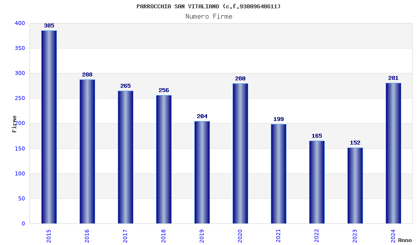 | Anno | Firme | Importi | Media | Naz. | Reg. | Prov. | Comu. |