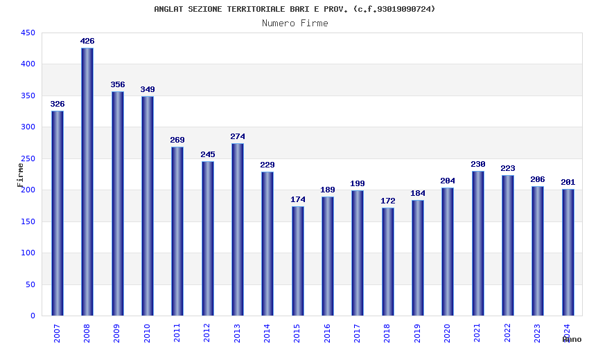 | Anno | Firme | Importi | Media | Naz. | Reg. | Prov. | Comu. |