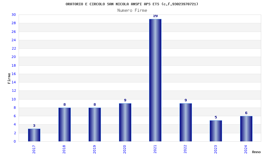 | Anno | Firme | Importi | Media | Naz. | Reg. | Prov. | Comu. |