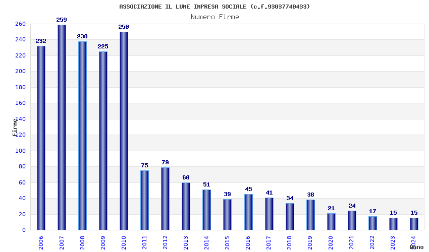 | Anno | Firme | Importi | Media | Naz. | Reg. | Prov. | Comu. |