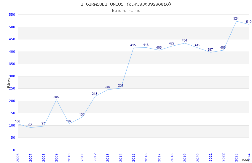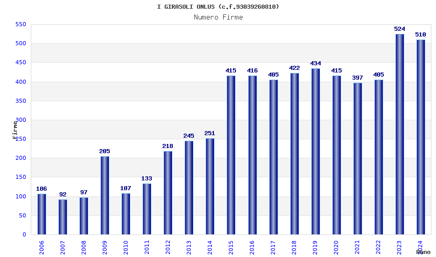 | Anno | Firme | Importi | Media | Naz. | Reg. | Prov. | Comu. |