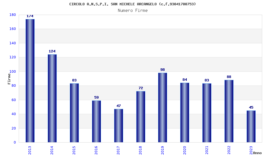 | Anno | Firme | Importi | Media | Naz. | Reg. | Prov. | Comu. |