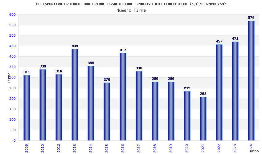 | Anno | Firme | Importi | Media | Naz. | Reg. | Prov. | Comu. |