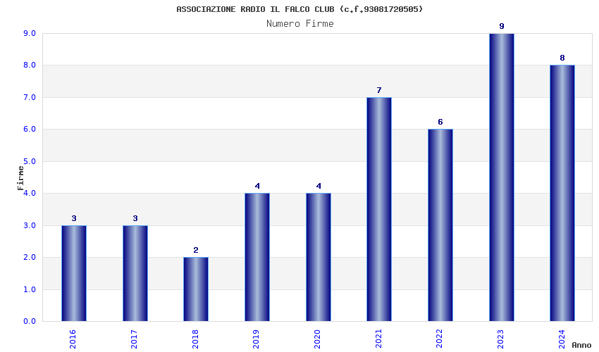 | Anno | Firme | Importi | Media | Naz. | Reg. | Prov. | Comu. |