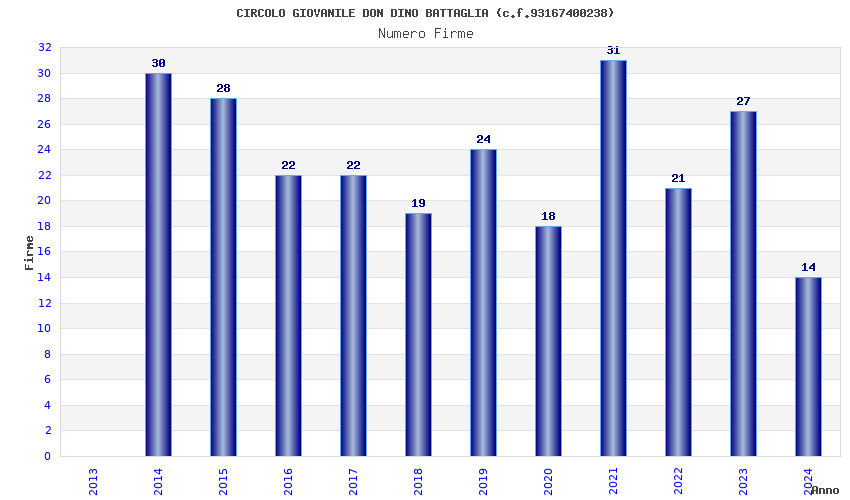 | Anno | Firme | Importi | Media | Naz. | Reg. | Prov. | Comu. |