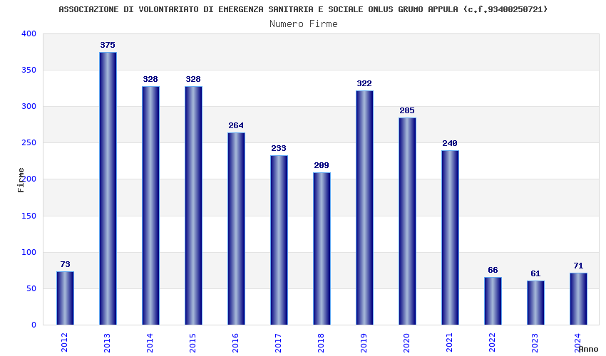 | Anno | Firme | Importi | Media | Naz. | Reg. | Prov. | Comu. |