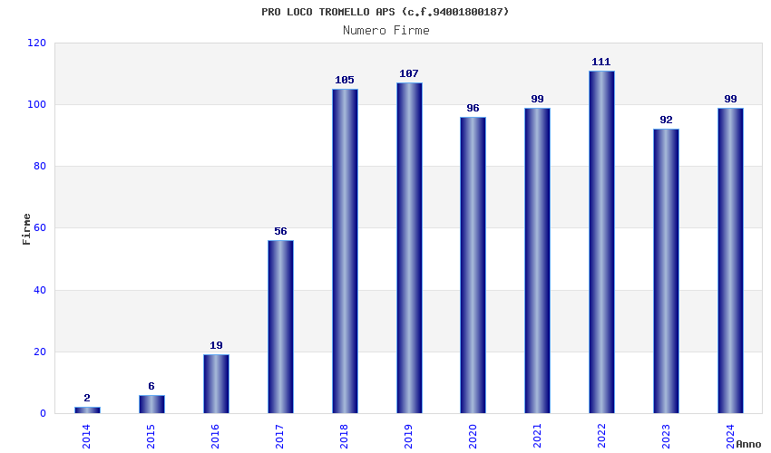 | Anno | Firme | Importi | Media | Naz. | Reg. | Prov. | Comu. |