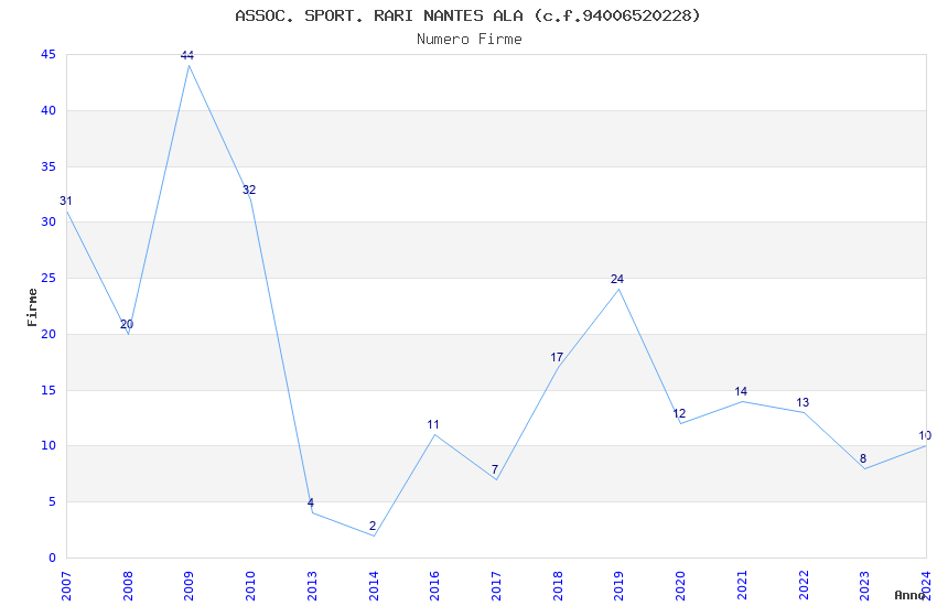 | 2009 | 44 | 1.456,07 | 33,09 | 19.714 | 560 | 287 | 5 |