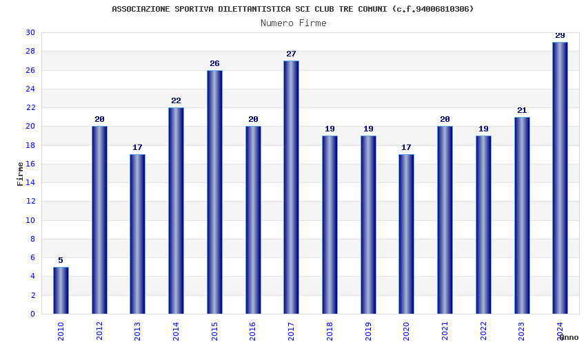 | Anno | Firme | Importi | Media | Naz. | Reg. | Prov. | Comu. |
