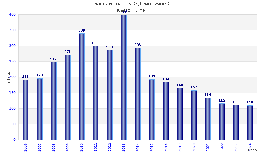 | Anno | Firme | Importi | Media | Naz. | Reg. | Prov. | Comu. |
