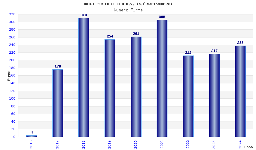 | Anno | Firme | Importi | Media | Naz. | Reg. | Prov. | Comu. |