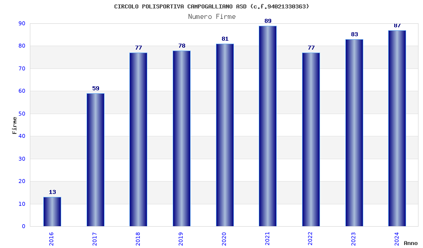 | Anno | Firme | Importi | Media | Naz. | Reg. | Prov. | Comu. |