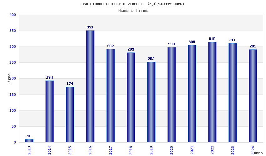 | Anno | Firme | Importi | Media | Naz. | Reg. | Prov. | Comu. |