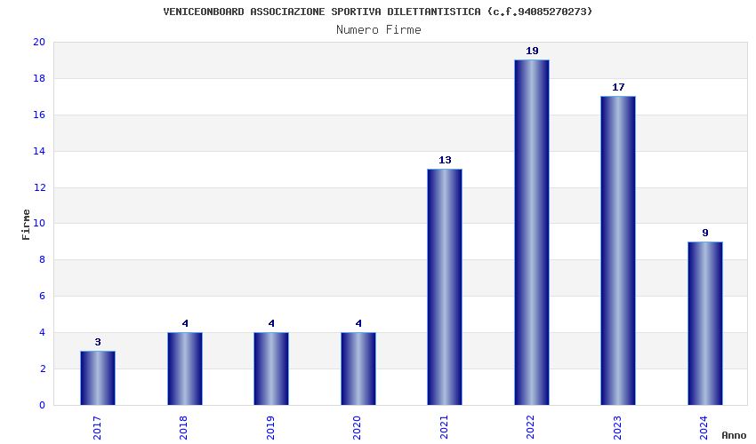 | Anno | Firme | Importi | Media | Naz. | Reg. | Prov. | Comu. |