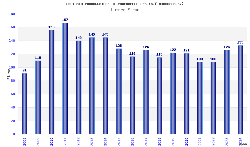 | Anno | Firme | Importi | Media | Naz. | Reg. | Prov. | Comu. |