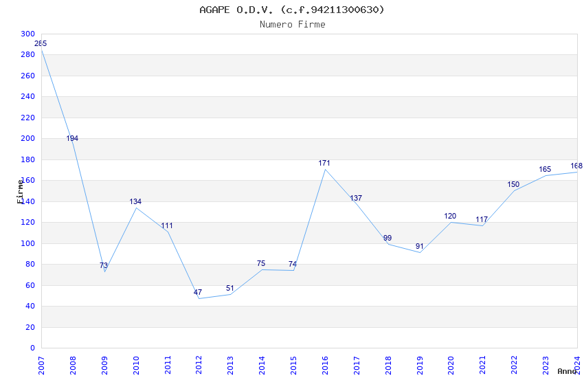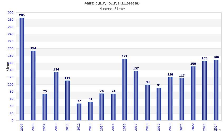 | Anno | Firme | Importi | Media | Naz. | Reg. | Prov. | Comu. |