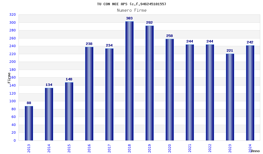 | Anno | Firme | Importi | Media | Naz. | Reg. | Prov. | Comu. |