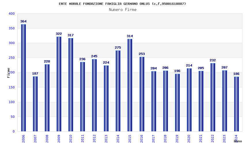 | Anno | Firme | Importi | Media | Naz. | Reg. | Prov. | Comu. |