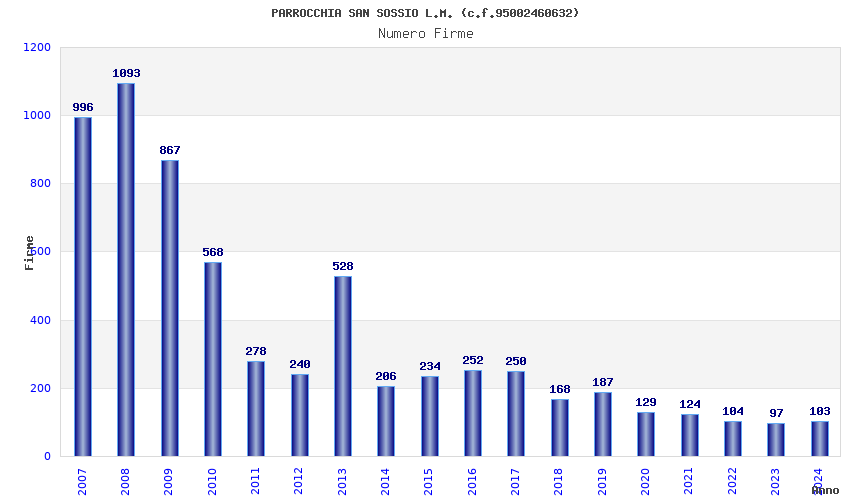 | Anno | Firme | Importi | Media | Naz. | Reg. | Prov. | Comu. |