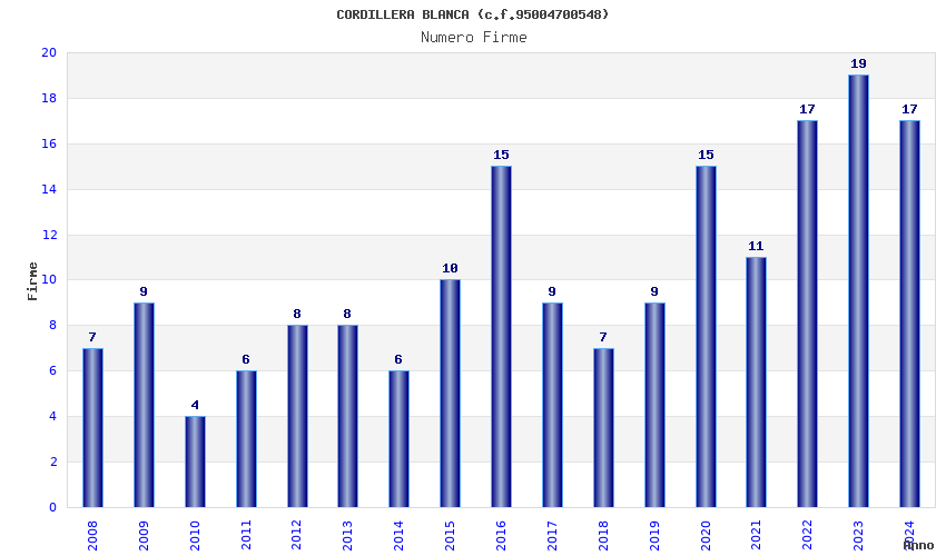 | Anno | Firme | Importi | Media | Naz. | Reg. | Prov. | Comu. |
