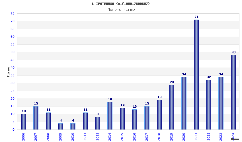 | Anno | Firme | Importi | Media | Naz. | Reg. | Prov. | Comu. |