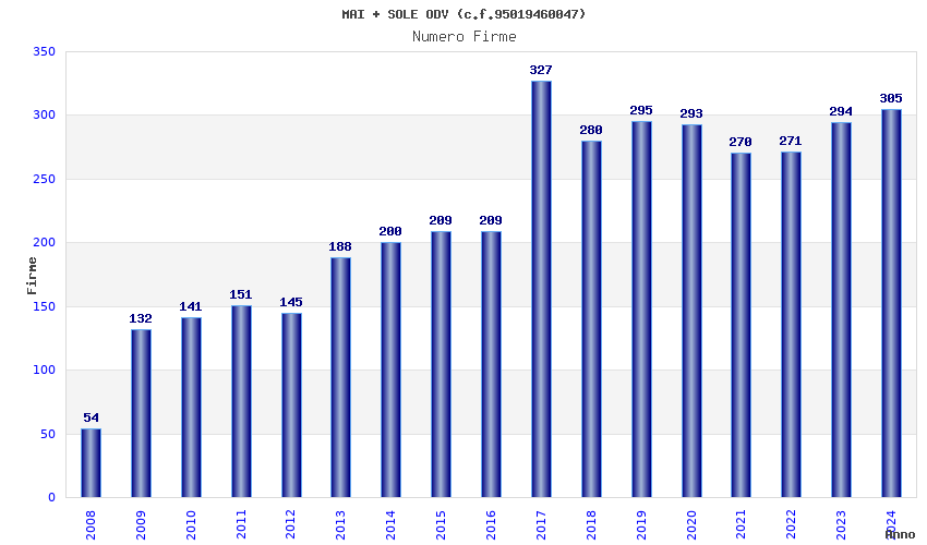 | Anno | Firme | Importi | Media | Naz. | Reg. | Prov. | Comu. |