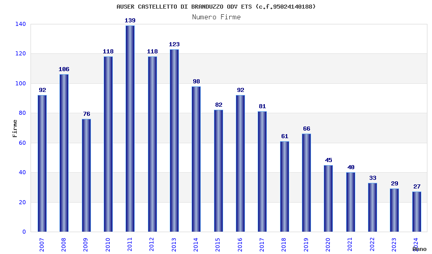 | Anno | Firme | Importi | Media | Naz. | Reg. | Prov. | Comu. |