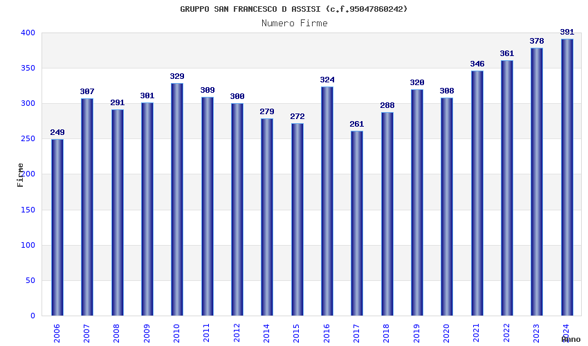 | Anno | Firme | Importi | Media | Naz. | Reg. | Prov. | Comu. |