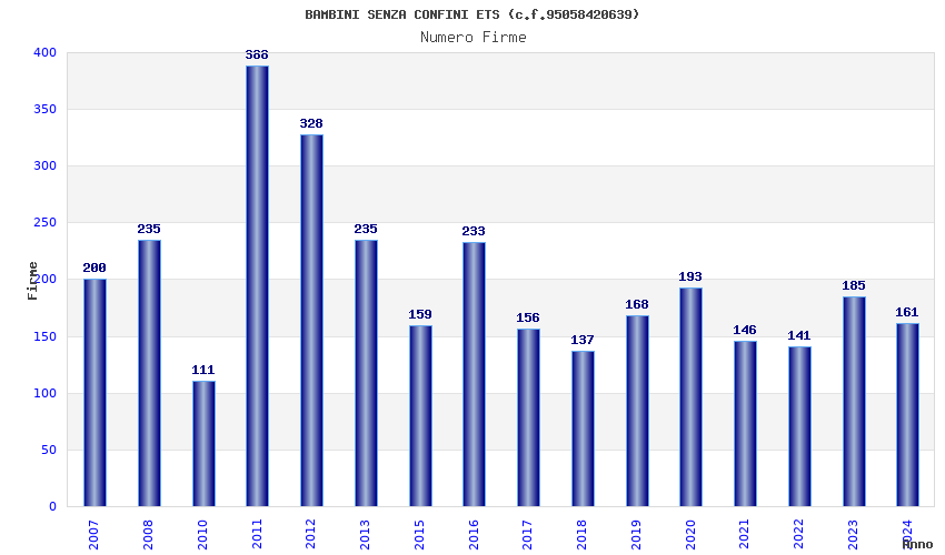 | Anno | Firme | Importi | Media | Naz. | Reg. | Prov. | Comu. |