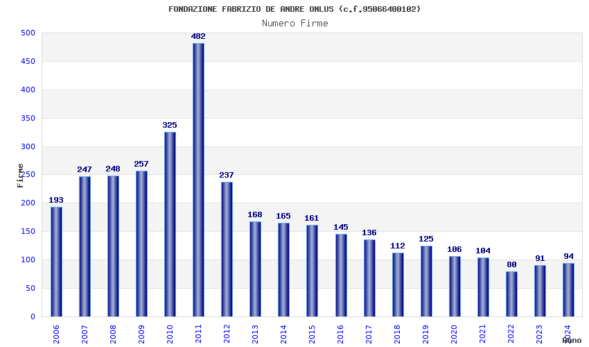 | Anno | Firme | Importi | Media | Naz. | Reg. | Prov. | Comu. |
