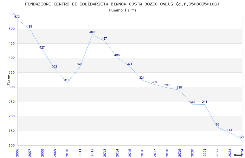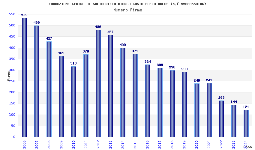 | Anno | Firme | Importi | Media | Naz. | Reg. | Prov. | Comu. |