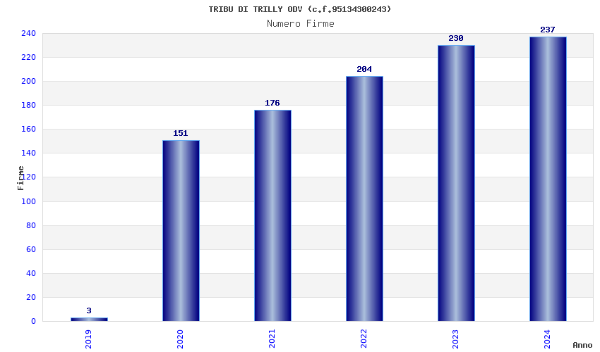 | Anno | Firme | Importi | Media | Naz. | Reg. | Prov. | Comu. |