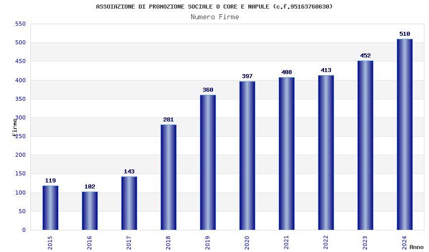 | Anno | Firme | Importi | Media | Naz. | Reg. | Prov. | Comu. |