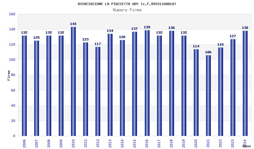 | Anno | Firme | Importi | Media | Naz. | Reg. | Prov. | Comu. |