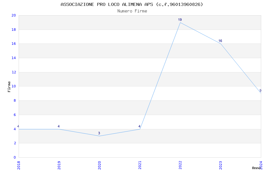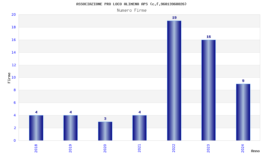 | Anno | Firme | Importi | Media | Naz. | Reg. | Prov. | Comu. |